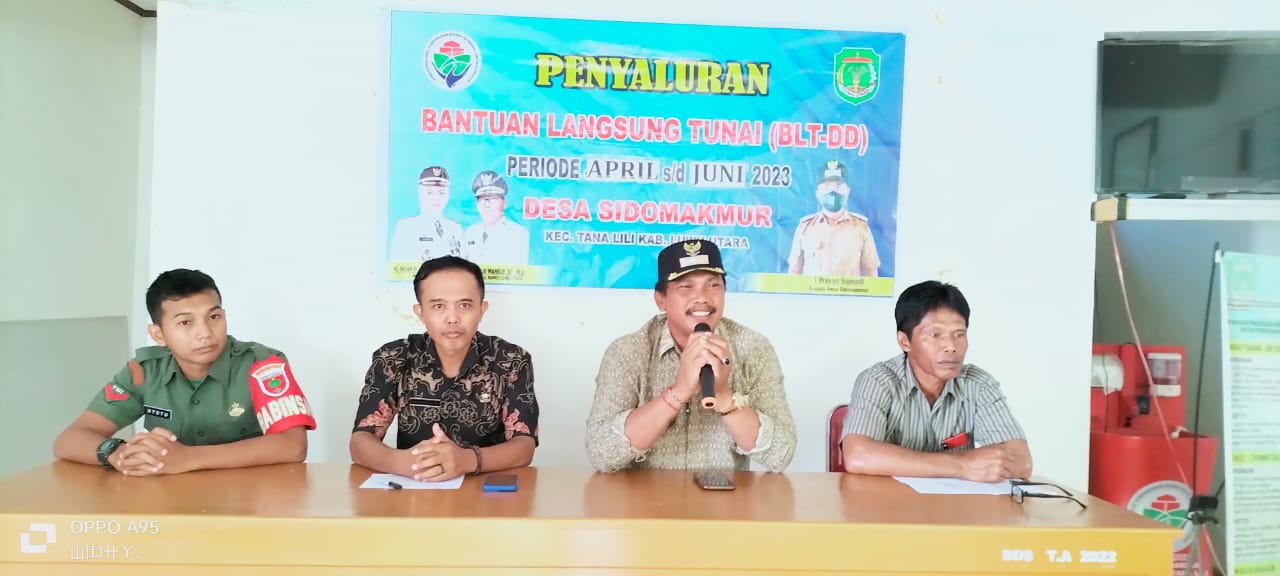 Kasi PMD kantor Camat Tana Lili menghadiri rapat Penyaluran Bantuan Langsung Tunai Dana Desa ( BLT DD ) Tahun Anggaran 2023 Di desa Sidomakmur yang dilaksanakan Pemdes Sidomakmur. Giat ini juga dihadiri Bhabinkamtibmas,BPD, Kadus dan Masyarakat penerima BLT desa Sidomakmur di Aula Kantor Desa Sidomakmur pada Kamis, 08 Juni 2023