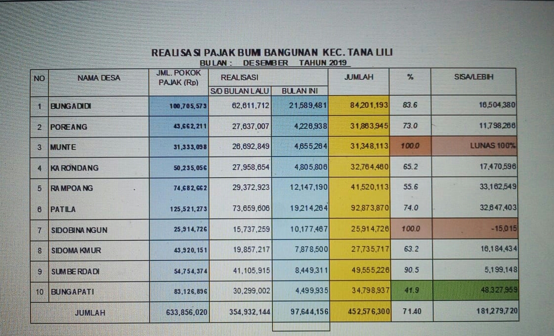 Realisasi PBB Kecamatan Tana Lili Tahun 2019
